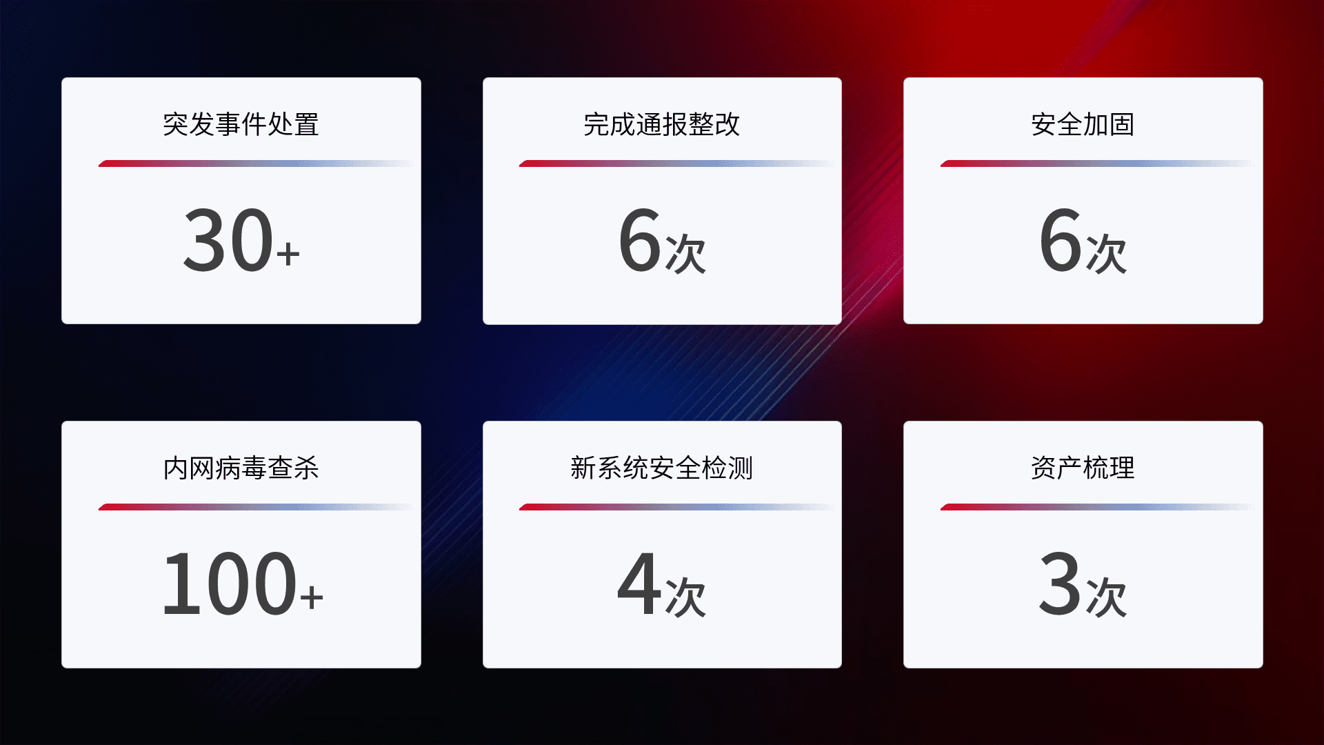 网络安全加固与风险管理:通过技术加固手段,,,,如加强区域隔离,,缩减攻击内网横向移动的范围;优化现有网络安全管理制度,,,,降低网络威胁暴露面,,,,减少被黑客攻击的可能性。。。。