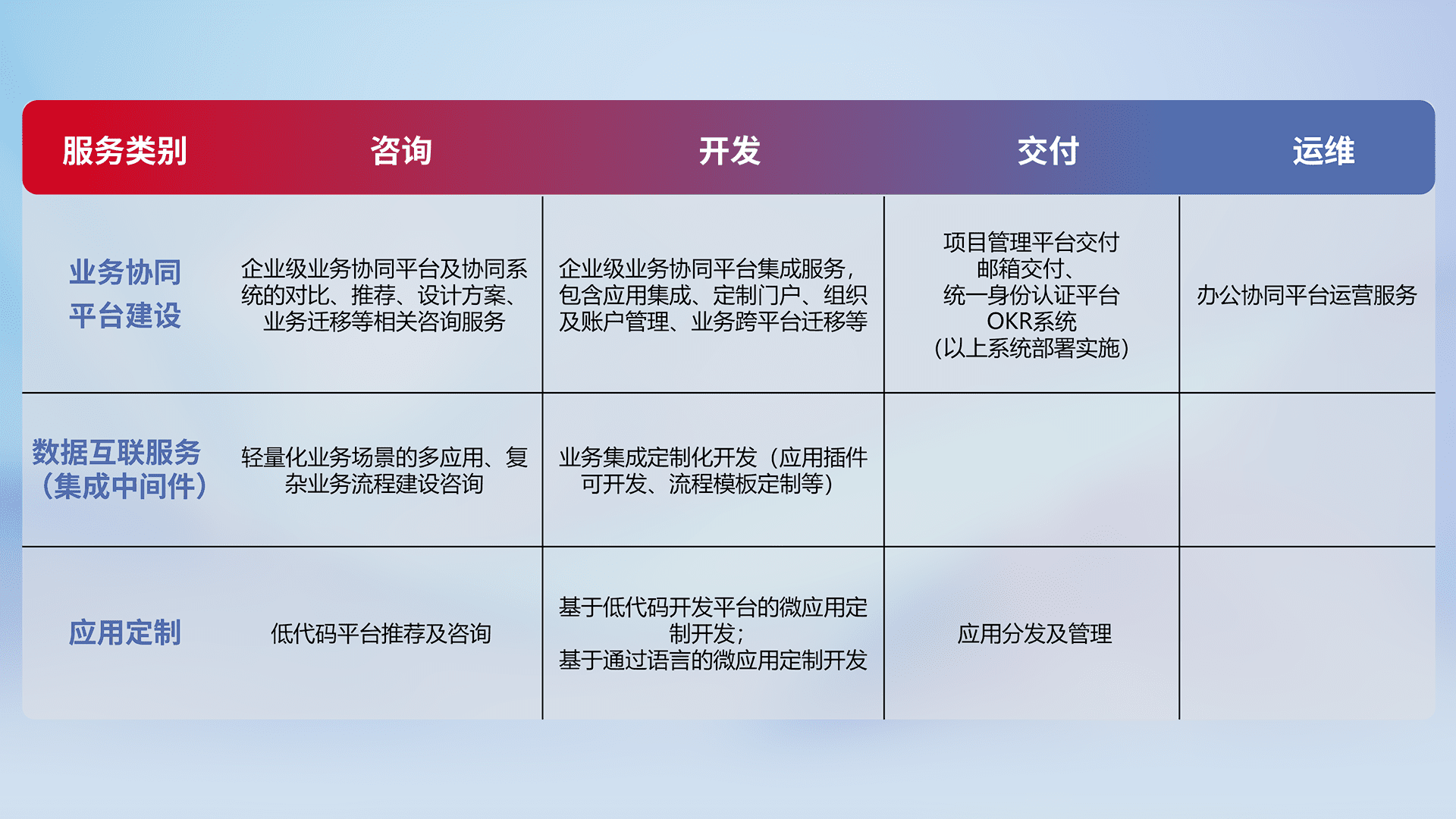 针对钉钉、、企微、、IDaas等平台级产品提供产品的规划、、、方案、、交付、、、定制化开发等服务,,实现如统一协同办公、、、、智能客户服务、、混合会议管理、、、智能数据查询、、、等业务场景,,,,实现数字化转型。。